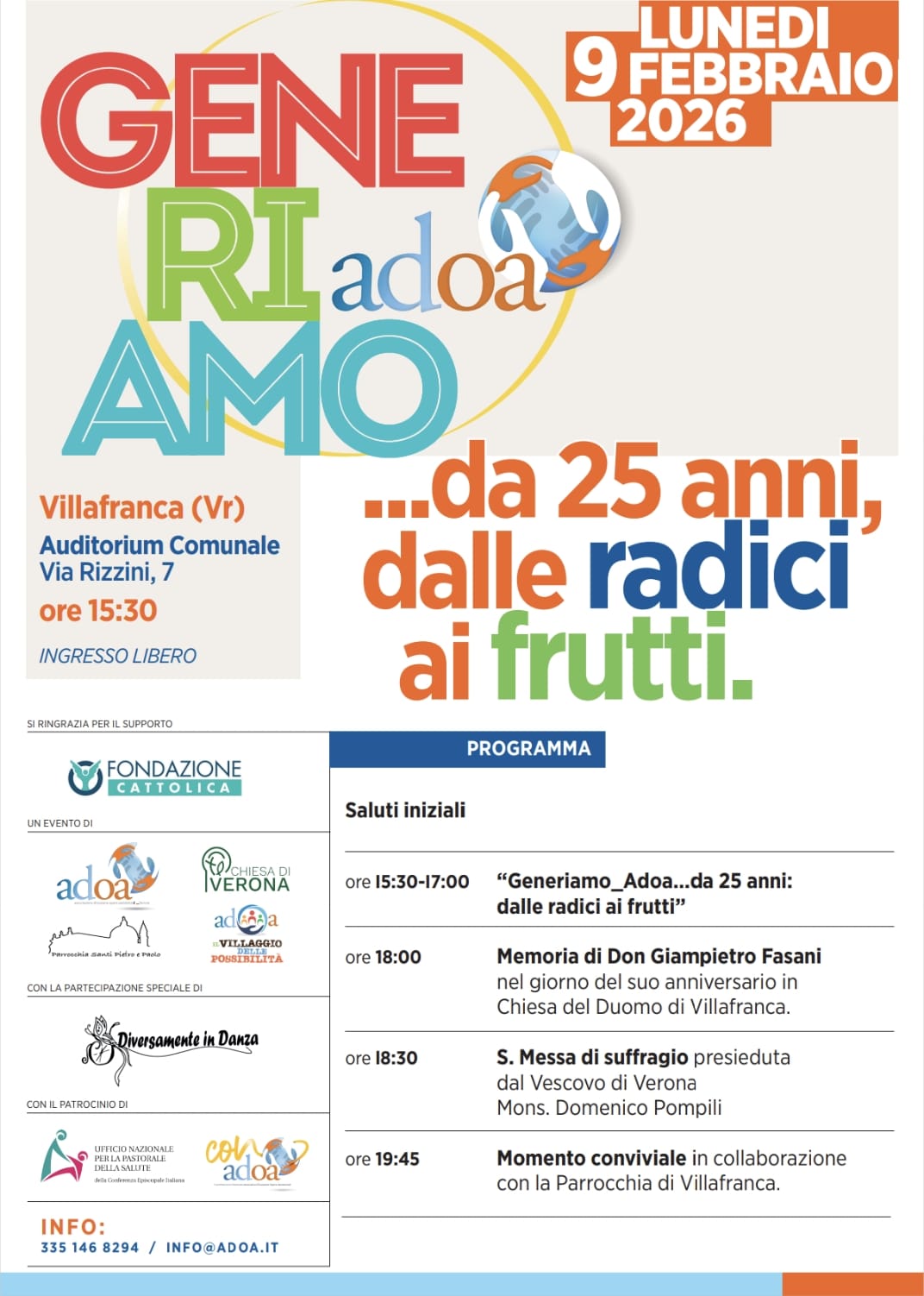 Con la presente si invita la S.V. all'evento "Generamo ADOA….da 25 anni... dalle radici ai frutti" dalle ore 15:30 presso l'Auditorium Comunale in Via Rizzini 7 a Villafranca di Verona, al quale seguirà S. Messa di suffragio nel giorno dell'anniversario della morte di Mons. Giampietro Fasani dalle 18:30 presso la Chiesa del Duomo.